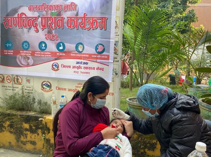विराटनगर, मंसिर २३ गते । जिल्ला आयुर्वेद स्वास्थ्य केन्द्र मोरङ्ग विराटनगरले ‘स्वर्ण विन्दु प्राशन’ (विशेष आयुर्वेदिक औषधि) पाँच वर्ष मुनिका बालबालिकालाई खुवाउन थालेको छ । जिल्ला आयुर्वेद स्वास्थ्य केन्द्र मोरङ्ग केन्द्रले ३४१ बालबालिकालाई ‘स्वर्ण विन्दु प्राशन’ खुवाइएको छ । जिल्ला आयुर्वेद स्वास्..