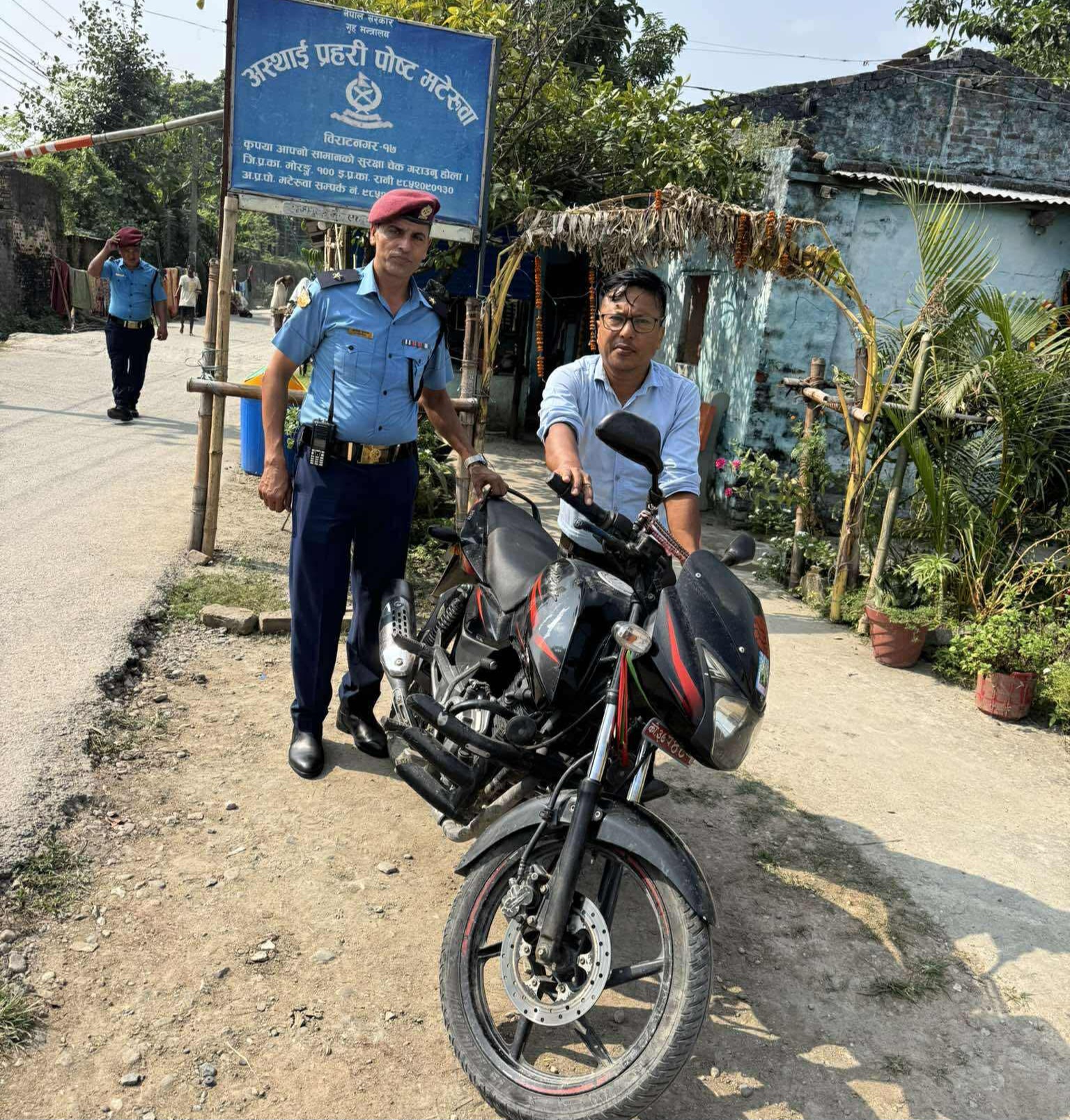 उक्त माेटरसाईकल सवारी धनी जीत बहादुर श्रेष्ठलाई जिम्मा लगाएकाे ईलाका प्रहरी कार्यालय रानीले जनाएकोछ ।