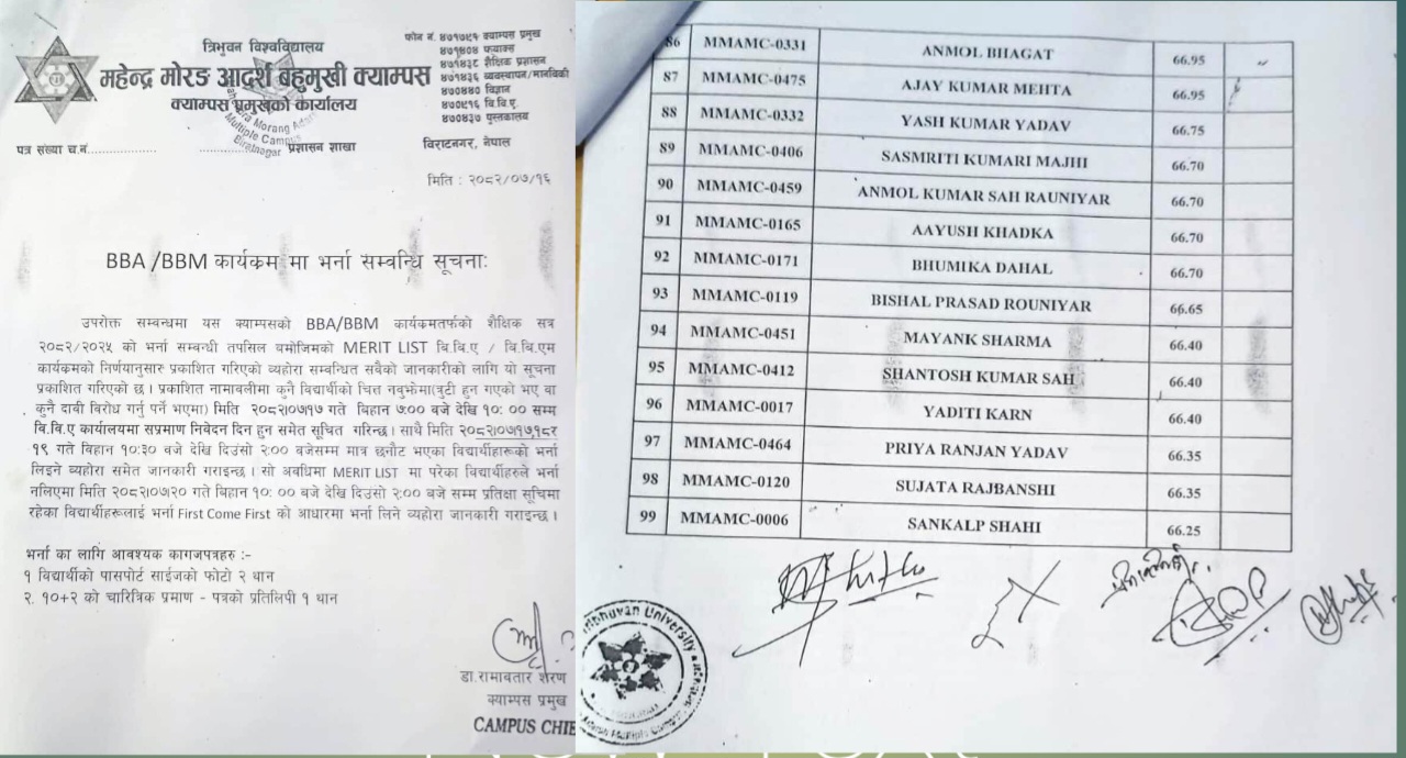 विराटनगर, कार्तिक १७ गते । महेन्द्र मोरंग आदर्श बहुमुखी क्याम्पस विराटनगरले विविए संकायमा भर्नाको लागि लिएकाे प्रवेश परिक्षाकाे नतिजा रातारात परिवर्तन गरेपछि विवाद उत्पन्न भएकाे छ