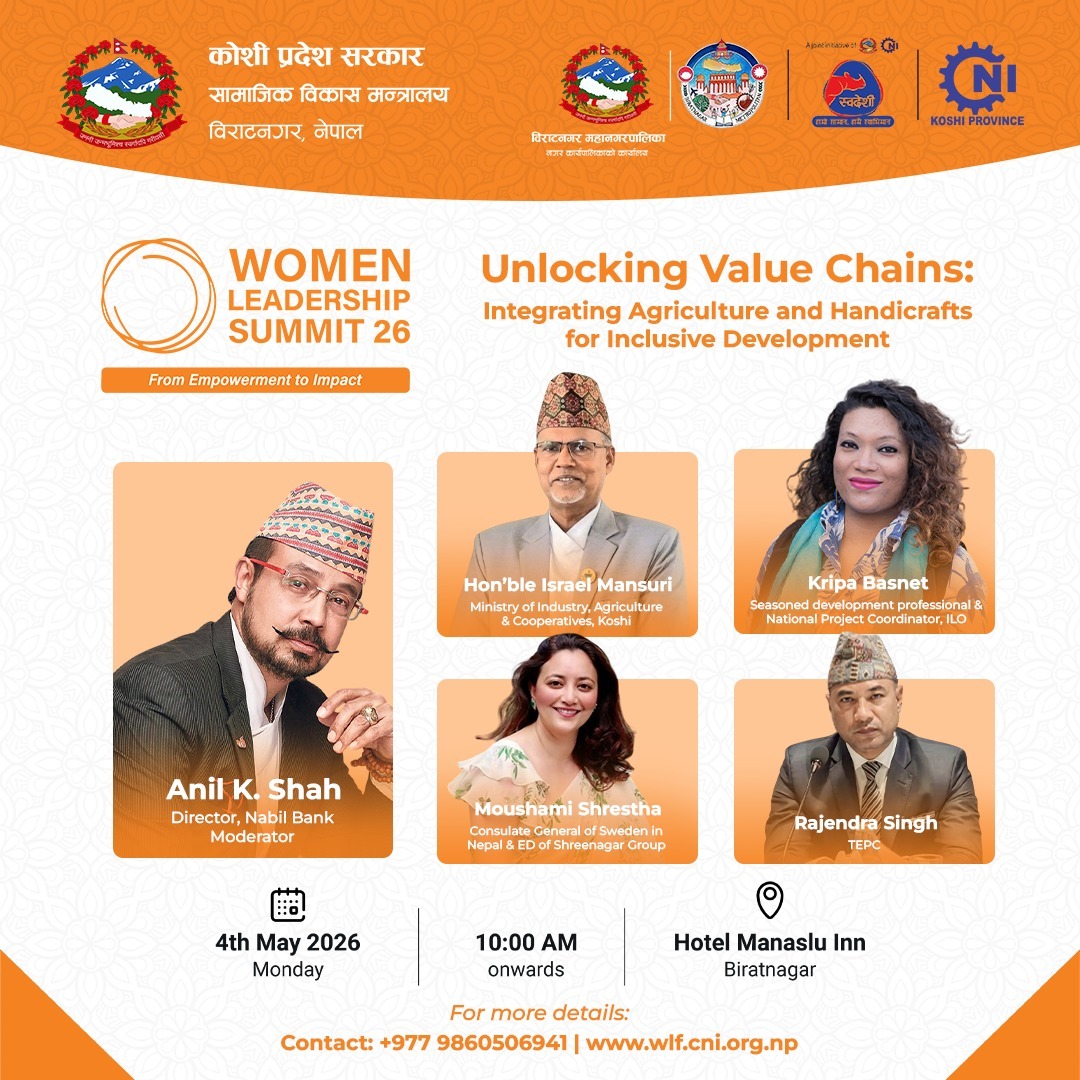 विराटनगर, बैशाख १७ गते । कोशी प्रदेश सरकार सामाजिक विकास मन्त्रालय, विराटनगर महानगरपालिकाे सहकार्यमा र नेपाल उद्योग परिसंघ नेपाल उद्योग परिसंघ कोशी प्रदेशको सयुक्त आयोजनामा महिला नेतृत्व सम्मेलन बैशाख २१ गते काेशी प्रदेशकाे राजधानी विराटनगरमा हुने भएकाे छ ।